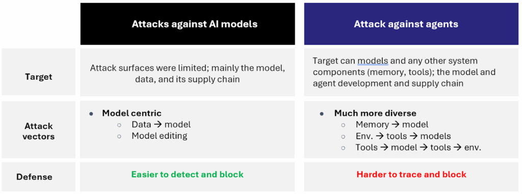 Figure 3 further compares AI model security with AI agent security. Given the complexity of the agent system, attacks against AI agents have more attack targets. As we will elaborate later, every system component can become the attack targets, not only the data and models. Besides, the attack vectors can be much more complex that involve more than one system component. As a result, attacks against AI agents are much harder to detect and defend against. It requires a combination of AI expertise as well as system and software security expertise, as the agents are hybrid systems with symbolic and non-symbolic components.