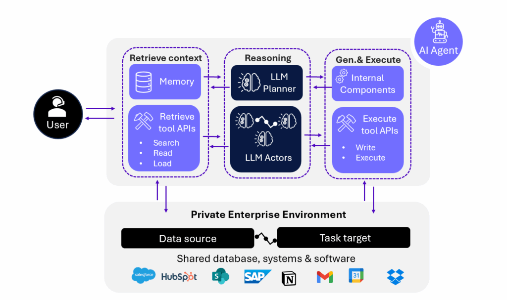 AI agents are next-level AI systems designed to automatically handle complex tasks. At their core, they’re powered by large language models (LLMs), but they go beyond just text generation. A typical AI agent is a hybrid system that combines the reasoning and planning power of LLMs with traditional software components like memory and a suite of tools it can use to interact with the outside world (public or private environment). An AI agent typically finishes a task via a sequence of actions. For example, if a user asks to make a payment for past transactions, the agent might break down the request into steps: check the account balance using a banking tool, review the transaction history, and finally complete the payment — all on its own. These agents aren’t one-size-fits-all either. You’ll find web agents that browse the internet, coding agents that write and debug software, and computer-use agents that automate workflows on your desktop. Powered by LLMs' ability to plan and reason, AI agents are pushing AI and automation to the next level. As shown in Figure 1, a typical AI agent contains the following components: