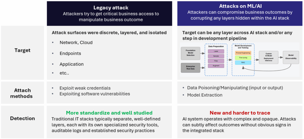 Figure.2 - Comparison of traditional software security and AI security in attack targets, methods, and defenses.