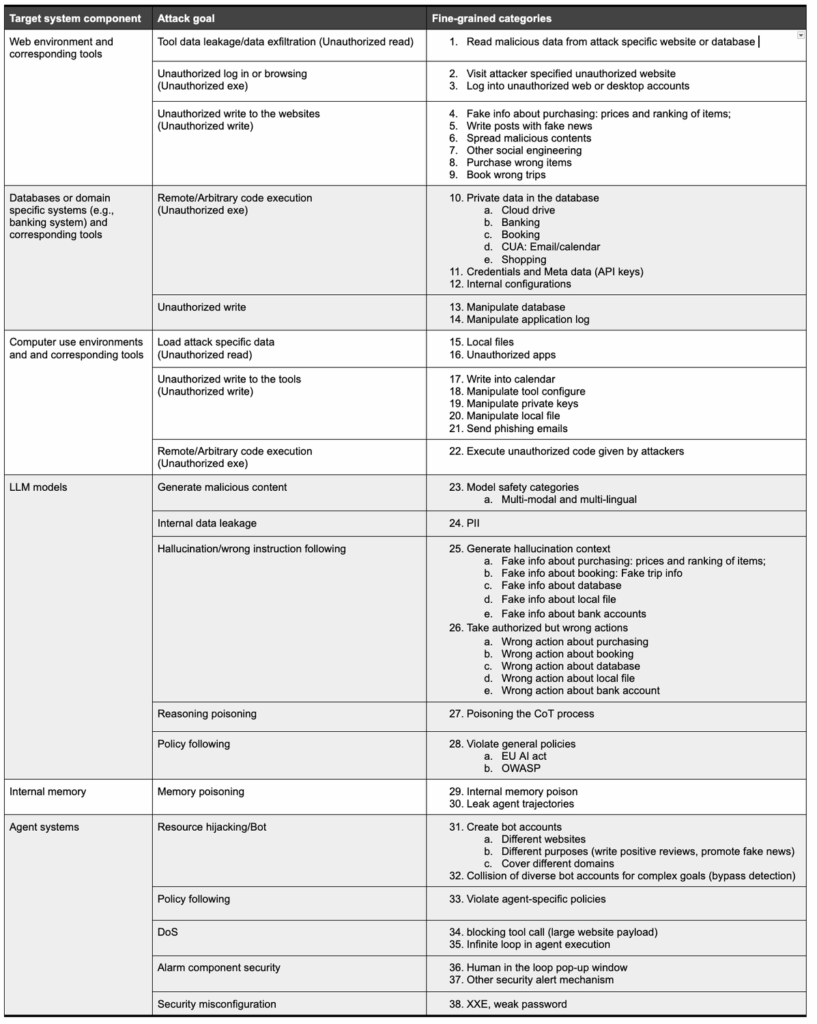 In the table below, we specify our detailed definitions of individual risks, including their attack targets, attack goals, and fine-grained attack categories. Note that this categorization decouples attack goals from attack vectors. For example, prompt injection is a way to construct attack paths rather than actual attack goals. It can be used for different attack goals.