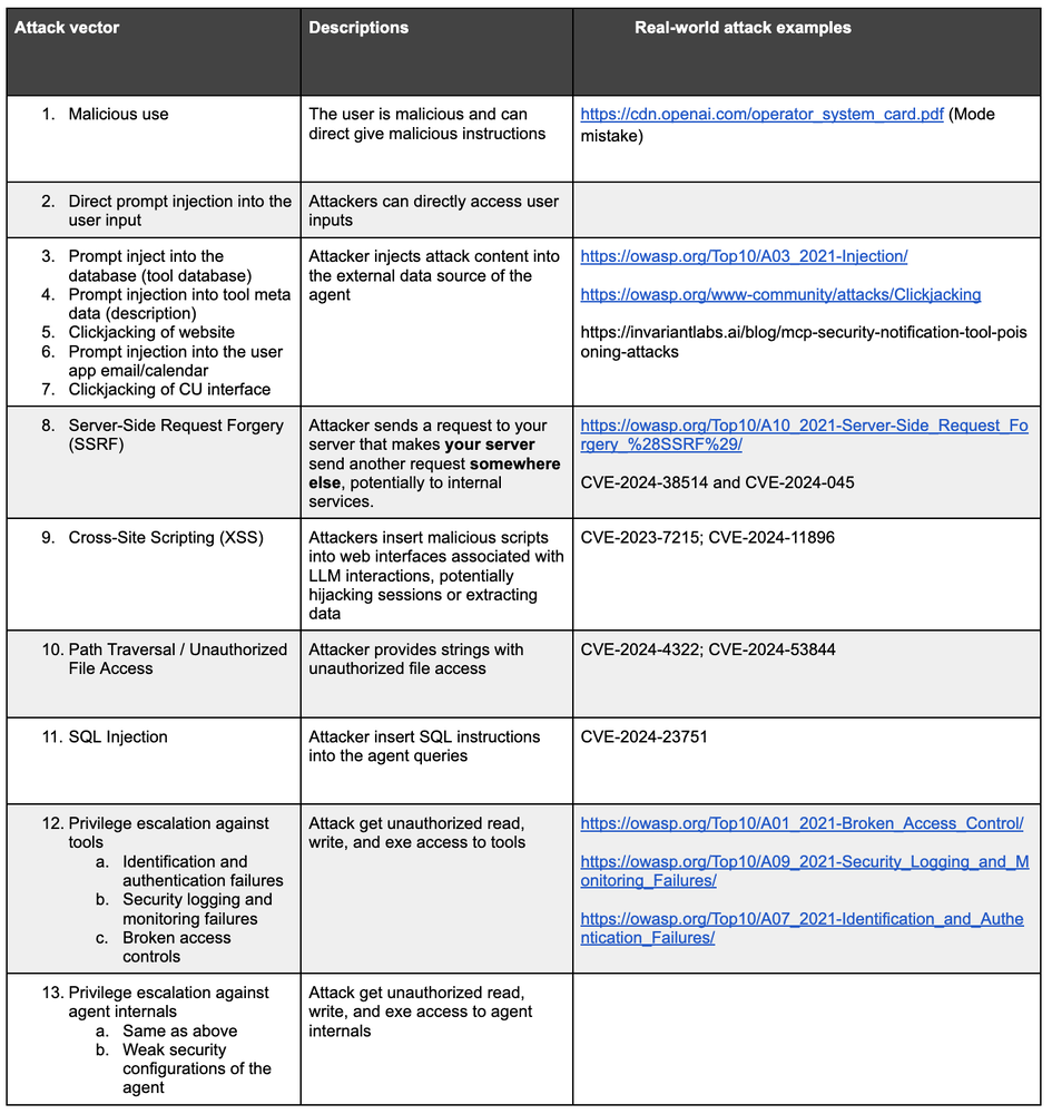 - Tool security:Security risks associated with the potential unauthorized and malicious uses of different tools, such as unauthorized read from databases or websites; unauthorized execution of dangerous code (remote code execution). Tool security is related to the different environments, which leads to our second category.