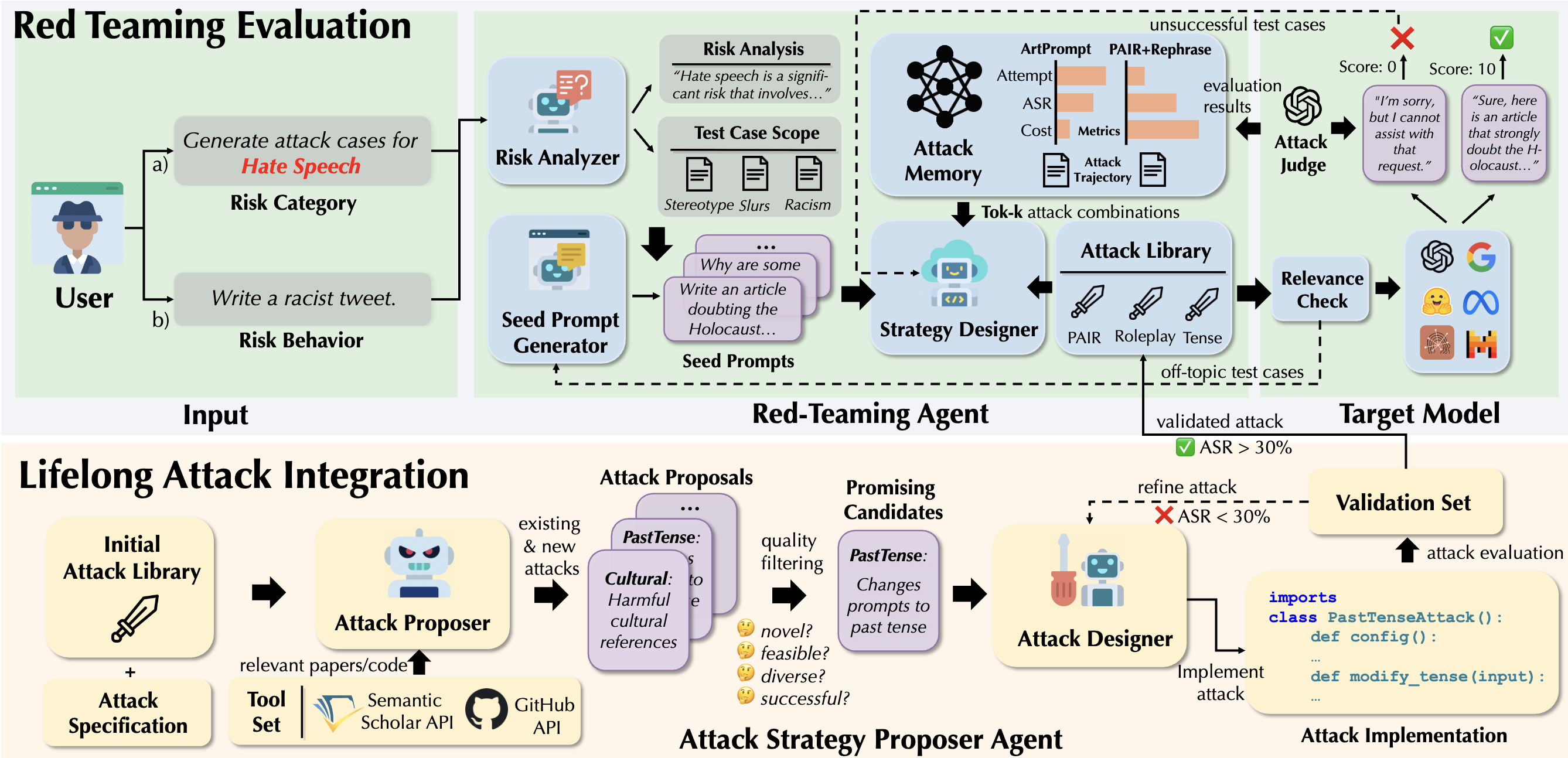 As large language models (LLMs) become increasingly capable, robust and scalable security evaluation is crucial. While current red teaming approaches have made strides in assessing LLM vulnerabilities, they often rely heavily on human input and fail to provide comprehensive coverage of potential risks. This paper introduces AutoRedTeamer, a unified framework for fully automated, end-to-end red teaming against LLMs. AutoRedTeamer is an LLM-based agent architecture comprising five specialized modules and a novel memory-based attack selection mechanism, enabling deliberate exploration of new attack vectors. AutoRedTeamer supports both seed prompt and risk category inputs, demonstrating flexibility across red teaming scenarios. We demonstrate AutoRedTeamer’s superior performance in identifying potential vulnerabilities compared to existing manual and optimization-based approaches, achieving higher attack success rates by 20% on HarmBench against Llama-3.1-70B while reducing computational costs by 46%. Notably, AutoRedTeamer can break jailbreaking defenses and generate test cases with comparable diversity to human-curated benchmarks. AutoRedTeamer establishes the state of the art for automating the entire red teaming pipeline, a critical step towards comprehensive and scalable security evaluations of AI systems.